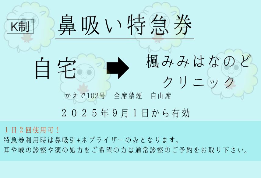 – 鼻吸い特急券ご利用時は順番予約を取らずにご来院ください。