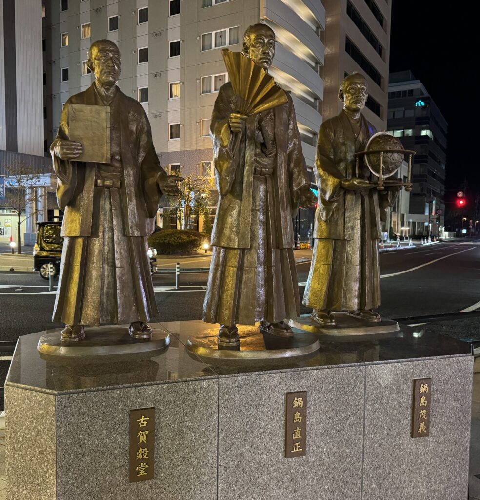 佐賀駅前には左から古賀穀堂公、鍋島直正公、鍋島茂義公の像などさまざまな佐賀出身の偉人の銅像を街中で見ることができます