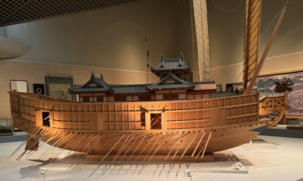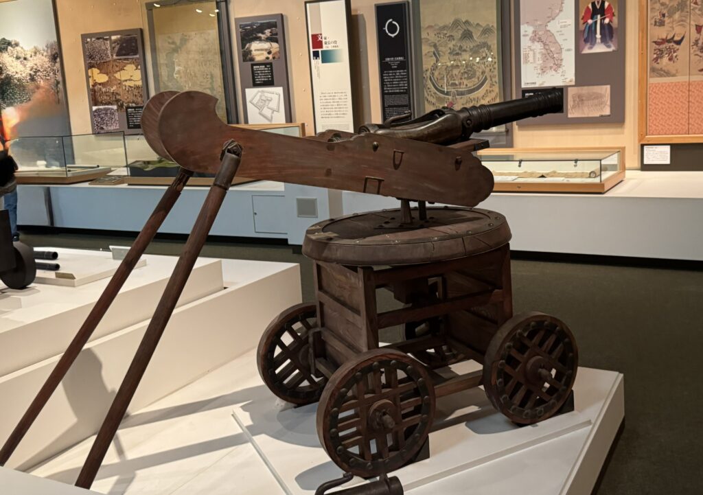 朝鮮水軍の軍船である亀甲船(きっこうせん)が10分の1で復元されています、先頭の龍の口から火が噴いたそうです、日本軍は鉄砲中心でしたが、朝鮮軍は大陸の明(中国の王朝)の影響を受けて大砲が多く用いられていました、陸戦では鉄砲が有効ですが、海戦になると鉄砲はあまり役に立たず、大砲が主戦力となります、初戦は陸戦を展開して有利だった日本軍が、最後は朝鮮軍により海戦に持ち込まれ、大砲でかなりの損害を受けたそうです