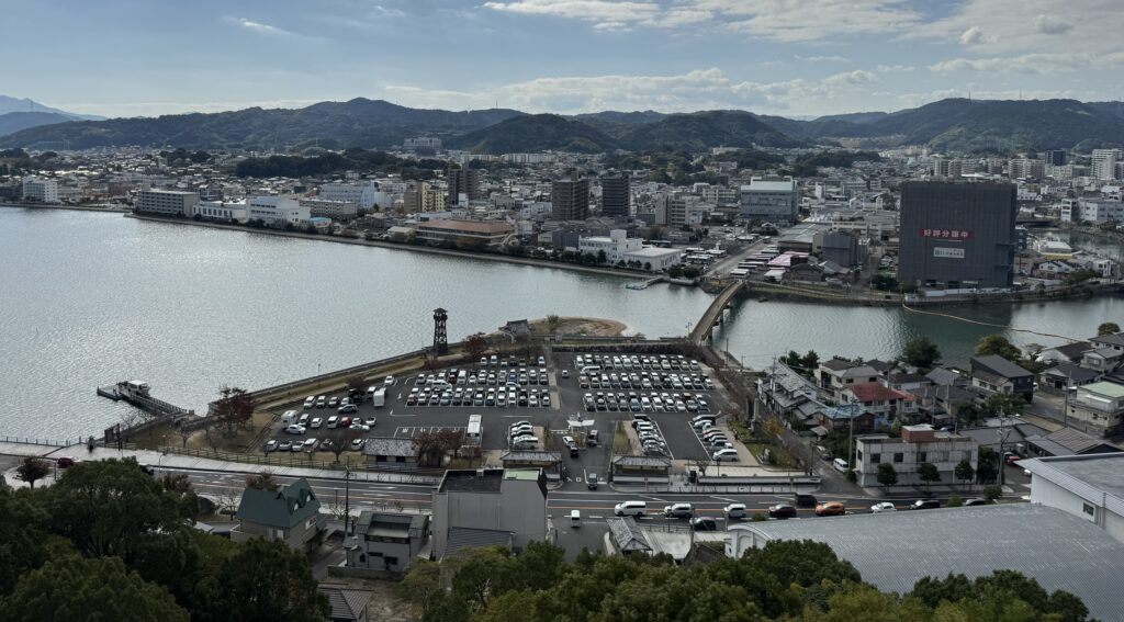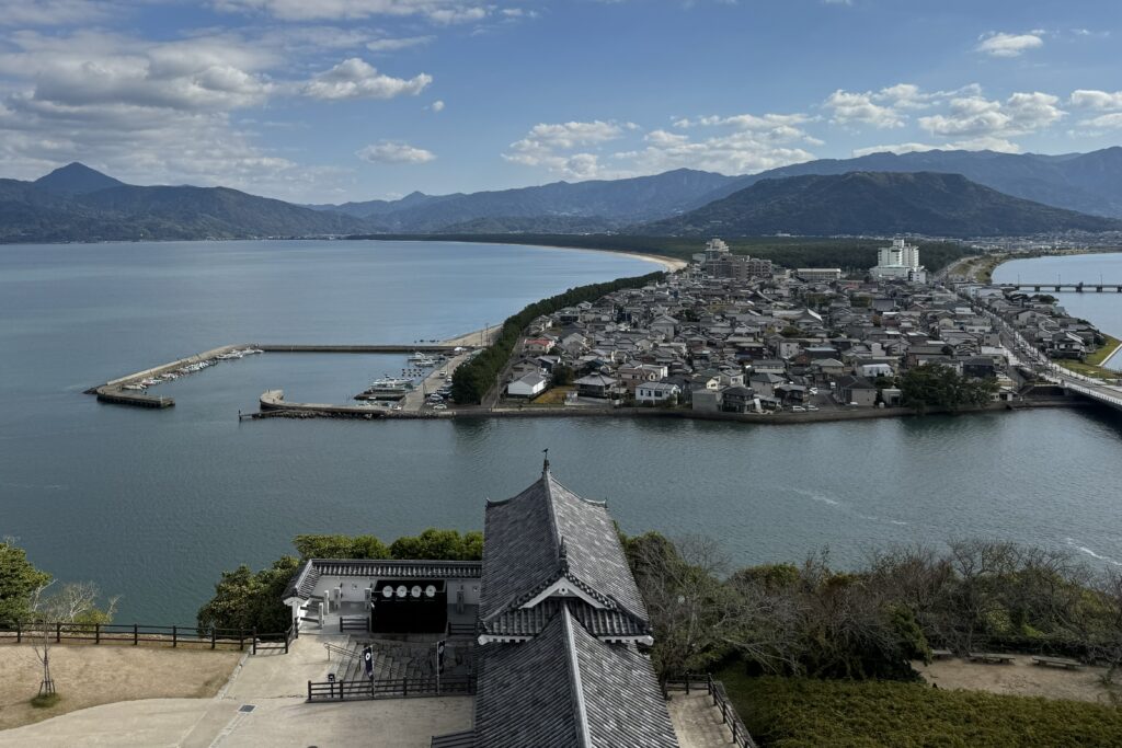 復元天守からの大パノラマ:虹の松原・唐津湾・市街を一望できる壮観。