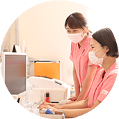 電子カルテの操作もマスターしているスタッフが代行入力(医療クラーク)につき、他にも患者さん誘導、補助、器具渡し等のサポートを実施、医師は診察に集中できるような環境を整えています。 -